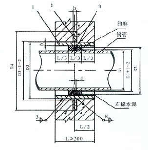 5、Ⅱ型套管穿牆(qiáng)處之牆壁,如遇非混凝土牆壁時應改用混凝土牆壁,其澆注混凝土範圍,Ⅱ型套管應比翼環(huán)直徑(D4)大200mm,而且必須將套管(guǎn)一次澆固於牆內。套管內的填料應緊密搗實。