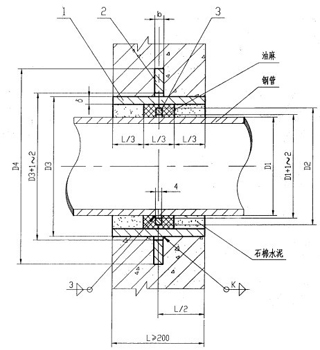 1. S312型剛性防水套管穿牆(qiáng)處如遇非混(hún)凝土(tǔ)牆壁時,應改用混凝土牆(qiáng)壁,其澆注範圍應比翼環直徑(D4)大200,而且必須將套管一次澆固於牆內,套管內的填料應緊密搗實。